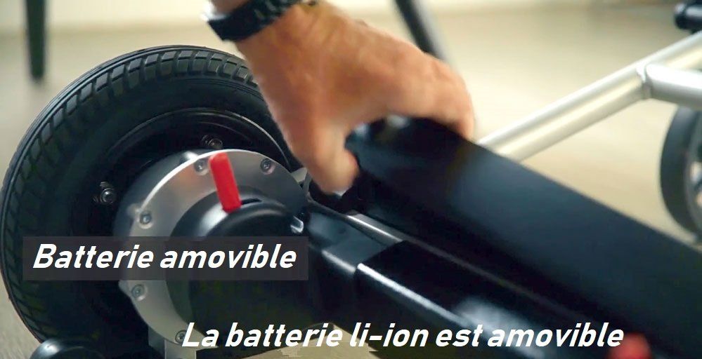 La batterie au lithium de Joy Rider se monte et se démonte rapidement dans un fauteuil roulant. Elle peut être rechargée dans un fauteuil roulant ou retirée. Même si votre Joy Rider est dans la voiture, vous pouvez retirer la batterie (avec une clé dédiée). Charge sur le chargeur.
