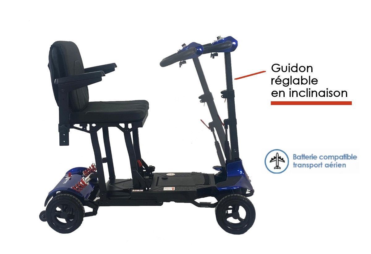 Le Scooter Swifty est doté de nombreux réglages ultra pratiques pour s’adapter à chaque utilisateur : Guidon réglable en hauteur et en inclinaison, Accoudoirs escamotables et amovibles (réglables en hauteur et en largeur), Amortisseurs Arrière. Pliage manuel en 3 secondes